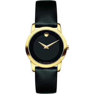 Yellow gold PVD stainless steel case with a black leather strap. Fixed yellow gold PVD bezel. Black dial with gold-tone hands and index hour markers. The movado dot marks the 12 o'clock position. Scratch resistant sapphire crystal. Case size: 29 mm. Water resistant upto 30 meters / 100 feet.