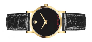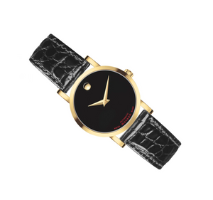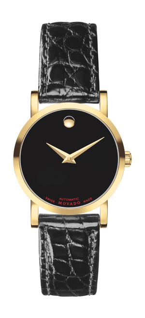Movado Red Label, 26 mm automatic watch with Yellow gold PVD stainless steel case with a black leather strap. Fixed yellow gold PVD bezel. Black dial with silver-tone dauphine-style hands. No markers. The Movado dot appears at the 12 o'clock position. Water resistance upto 30 meters.