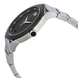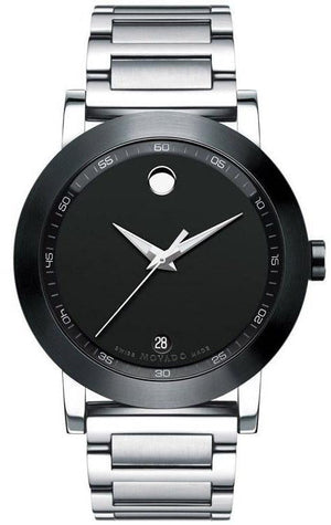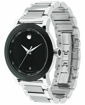 Stainless steel case with a stainless steel bracelet. Fixed stainless steel bezel. Black museum dial with silver-tone hands. The Movardo Dot appears at the 12 o'clock position. Swiss quartz movement. Scratch resistant sapphire crystal. Steel crown. Solid case back. Case diameter: 42 mm. Cas thickness 10 mm. Deployment clasp. Water resistant at 30 meters / 100 feet.