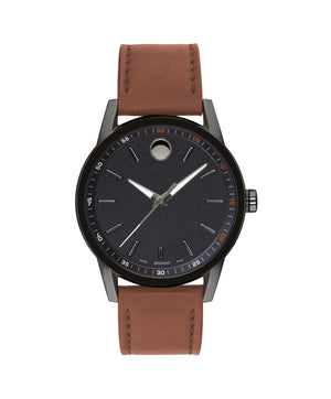Men's Museum Sport watch, 42 mm gunmetal PVD-finished stainless steel case with black PVD-finished bezel, round black 3-hand dial with black minute reflector ring, black dot and luminescent hands, smooth cognac calfskin strap with gunmetal PVD-finished stainless steel buckle. Quartz movement. Water resistant to 30 meters.