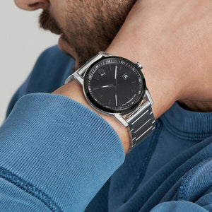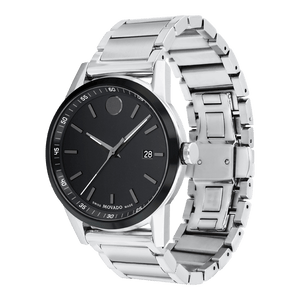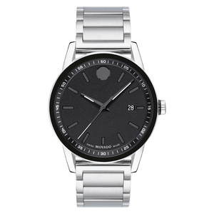 Movado Museum Sport, 42 mm stainless steel case with black PVD-finished bezel. Features a black dial and stainless steel bracelet. Scratch resistant sapphire crystal, push-button deployment clasp, swiss quartz movement. Case size 42 mm. Water resistance upto 30 meters.