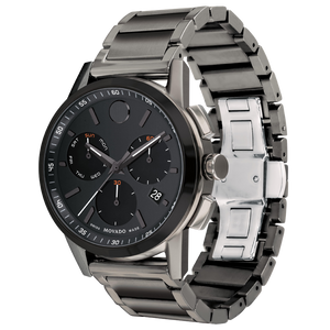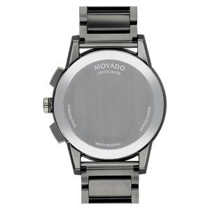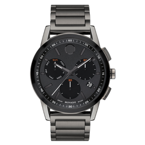 Movado Museum Sport Chronograph, 43 mm gunmetal PVD-finished stainless steel case with black PVD-finished bezel. Features a black chronograph dial and gunmetal PVD-finished bracelet. Quartz movement. Water resistance upto 30 meters.