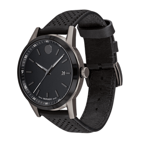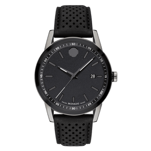 From the Movado Museum Sport Collection, this men's watch features a black dial with luminous black hands, markers and signature dot at the twelve o'clock hour, a date display at the three o'clock hour, with a black PVD-plated bezel and sapphire crystal in a 42.0mm gunmetal grey PVD-plated stainless steel case. Ensuring accuracy, the reliable swiss quartz movement keeps you right on time. The perforated black leather strap secures with a buckle clasp. Water-resistant to 30 meters.