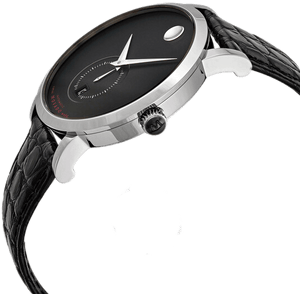 Silver-tone stainless steel case with a black (alligator) leather strap. Fixed silver-tone stainless steel bezel. Black dial with silver-tone hands. No markers. Movado dot appears at the 12 o'clock positions. Dial Type: Analog. Date display above the 6 o'clock position. Automatic movement. Scratch resistant k1 mineral crystal. Pull / push crown. Solid case back. Round case shape, case size: 42 mm, case thickness: 8.3 mm. Band width: 20 mm. Tang clasp. Water resistant at 30 meters / 100 feet. Functions: hour, minute, second. Casual watch style. Watch label: Swiss Made. Movado Automatic Black Dial 42 mm Men's Watch 0607370.