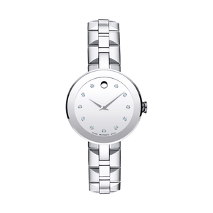 Women's Sapphire watch, 28.0 mm stainless steel bezel-free case with flat edge-to-edge sapphire crystal, round silver mirror dial with 11 diamond markers (0.042 t.c.w.), silver-toned signature dot and hands, stainless steel pyramid-shaped link bracelet with butterfly deployment clasp, Swiss quartz movement, water resistant to 30 meters.