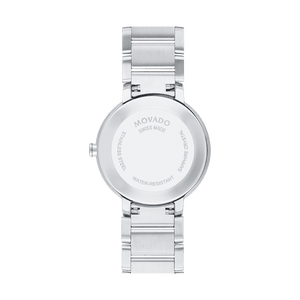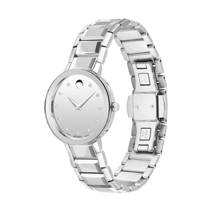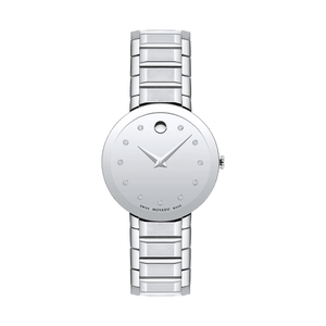 Movado Sapphire, 28 mm stainless steel bezel-free case with flat edge-to-edge sapphire crystal. Features a stainless steel bracelet with a silver mirror dial and 11 diamond markers. Swiss quartz movement. Case size 28 mm. Water resistance upto 30 meters.