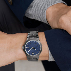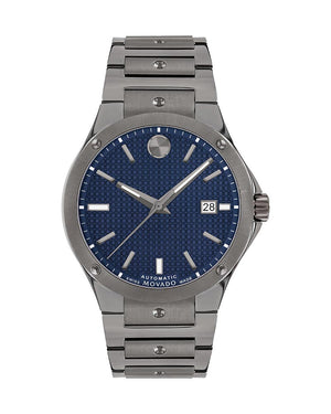 Movado SE automatic, 41mm dual finished mid grey PVD stainless steel case and bracelet with mid grey PVD concave polished dot accents and dura904 steel bezel. Features a blue Pavés de Paris dial, anti reflective Sapphire crystal, anti corrosive bezel, screw down crown, date window, and swiss super lumimova hands, hour markers and indices at 3:00, 6:00 and 9:00. Powered by the 608A caliber automatic movement with a quick setting calendar date, stop-second function and rapid reset mechanism showcased through an exhibition caseback. Case size 41mm. Water resistant up to 100 meters. Sapphire crystal. Push button deployment clasp.