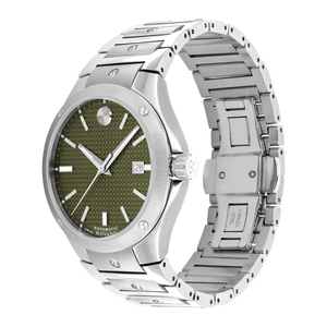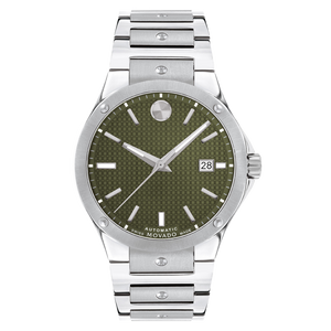 Exquisite Swiss craftsmanship meets modern, sporty design in the SE Automatic watch. Powered by the motion of your body, this watch is driven by a 608A caliber automatic movement housed in a 41mm dual-finished durable stainless steel case with a stunning exhibition caseback. It’s bezel is crafted of Dura904, an innovative steel prized for its nearly indestructible nature, comfort on the skin, and ability to hold a beautiful polish . We’ve added a signature touch with our iconic dot motif displayed at 12 o’clock and in subtle concave accents at the bezel and bracelet. Covered in anti-reflective sapphire crystal, the dial features a bold, geometric Pavés de Paris pattern in green, a date window and Swiss Super-LumiNova hands, hour markers and indices at 6:00 and 9:00. Automatic watches do not contain batteries. They are charged by the movement of your wrist. If the watch is not worn it will stop running in about 38 hours. To get it started, turn the crown clockwise about 20-30 times until the second hand starts moving. You will most likely need to reset the time and date.