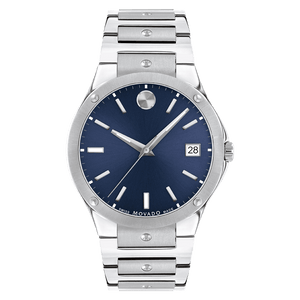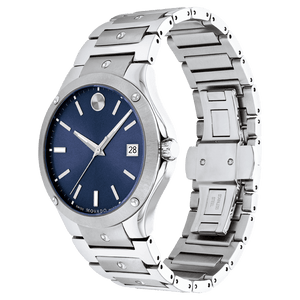 Movado SE, 41mm dual finished stainless steel case and bracelet with silver concave polished dot accents and blue sunray dial. Features an anti-reflective Sapphire crystal, anti-corrosive bezel, date window, and Swiss Super-LumiNova hands, hour markers & indices at 6:00 and 9:00. Case size 41 mm. Water resistance upto 50 meters.