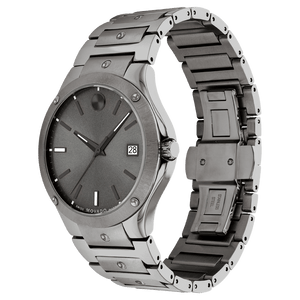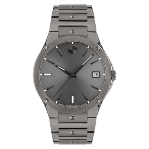 Movado SE, 41mm dual finished mid grey PVD stainless steel case and bracelet with mid grey concave polished dot accents and mid grey sunray dial. Features an anti-reflective Sapphire crystal, anti-corrosive bezel, date window, and Swiss Super-LumiNova® hands, hour markers & indices at 6:00 and 9:00.