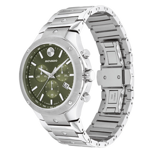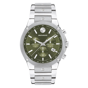 The Movado SE is defined by Swiss craftsmanship and sport-elegant design. This 42mm chronograph watch features a green sunray dial, Swiss Super-LumiNova accents, and our signature dot motif. Stainless steel case and bracelet with push button deployment clasp. Quartz movement. Water resistance up to 50 meters.