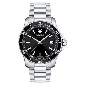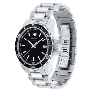 Stainless steel case with a stainless steel bracelet. Uni-directional rotating stainless steel bezel with a black aluminum ring. Black dial with luminous silver-tone hands and index hour markers. Arabic numeral minute markers (at 5 minute intervals). Minute markers around the outer rim. The Movado dot appears at the 12 o'clock position. Dial Type: Analog. Luminescent hands and markers. Date display at the 3 o'clock position. Quartz movement. Scratch resistant sapphire crystal. Screw down crown. Solid case back. Round case shape. Case size: 40 mm. Case thickness: 11 mm. Band width: 20 mm. Fold over clasp. Water resistant at 200 meters / 660 feet. Functions: date, hour, minute, second. Series 800 Series. Sport watch style. Watch label: Swiss Made. Movado Series 800 Black Dial Stainless Steel Men's Watch 2600135.