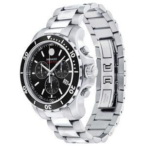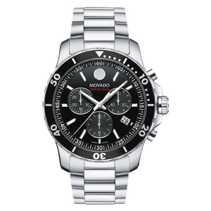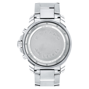 Movado Series 800, 42 mm Performance Steel case and bracelet with black chronograph dial. Stainless steel case and bracelet with push button deployment clasp. Quartz movement. Water resistance up to 200 meters.