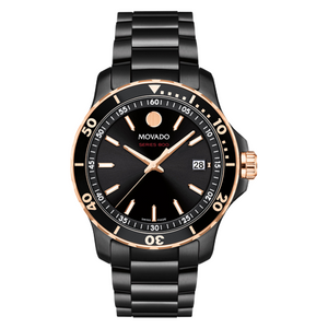 A modern take on elevated sporty style. Cast in deep ebony black and warm rose gold PVD, this watch is a contemporary-cool statement piece. The 40mm case frames a black sunray dial with Swiss Super-LumiNova® accents at the hand and hour markers, a date window, and our iconic dot at 12 o’clock. A diver-inspired bezel and fluid bracelet complete this must-have design. Water resistance upto 200 meters.