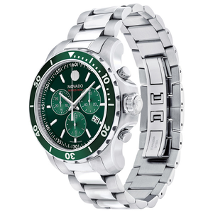Sport-inspired design elevated to new heights. A statement-making green dial and a diver-inspired unidirectional rotating bezel create the ultimate example of refined, contemporary sport style. This watch features a 42mm case, screw-down crown and signature Series 800 case back. The chronograph dial has three sub dials, Swiss Super-LumiNova® accents at the hands and hour markers, a date window, and our iconic dot at 12 o’clock. A matching stainless steel bracelet completes this must-have design. Water resistance up to 200 meters. Deployment clasp.
