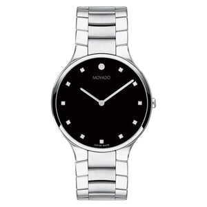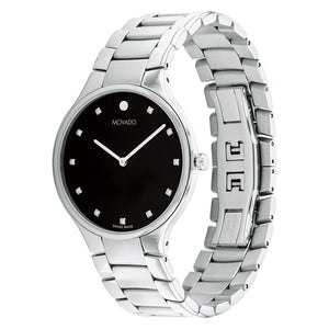 Movado serio watch, 38mm stainless steel case, link bracelet with deployment buckle, black museum dial with diamond markers, sapphire crystal, swiss quartz movement. Water resistance up to 30 meters.