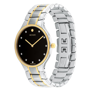 Movado serio watch, 41mm yellow PVD and stainless steel case, link bracelet with deployment buckle, black Museum dial with diamond markers,sapphire crystal, swiss quartz movement. Water resistance up to 30 meters. Deployment buckle clasp.