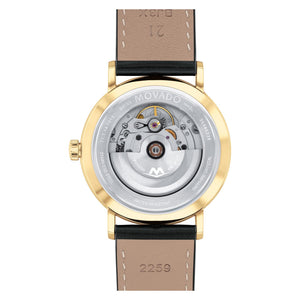 Mens movado signature automatic, 40mm yellow PVD case, black dial with date window, sapphire crystal, swiss automatic movement. Black leather strap. Watre resistance up to 30 meters. Pin buckle clasp.