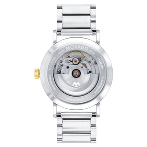Mens movado signature automatic, 40mm stainless steel yellow PVD case and bracelet with black dial date window, single diamond marker12. sapphire crystal. Automatic movement. Case size 40mm Water resistance up to 30 meters. Sapphire crysyal. Push button deployment.