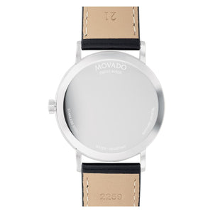 Movado signature unisex watch. Stainless steel case with a black dial, black leather strap. Quartz movement. Sapphire crystal. Case size 40mm. Water resistance upto 30 meters. Tang clasp.