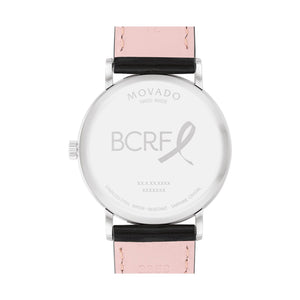 BCRF exclusive, movado signature, 40mm stainless steel case, black museum dial featuring stainless steel polished hands, black leather strap lined with pink leather, sapphire crystal, swiss quartz movement. Water resistance up to 30 meters. Pin buckle clasp.