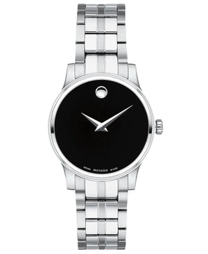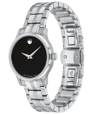 Movado women's swiss stainless steel bracelet and case. Swiss quartz movement, push button deployment clasp. Scratch resistance sapphire glass with black dial with dot marker. Case size 28mm. Water resistance upto 30 meters.