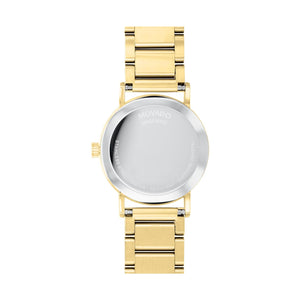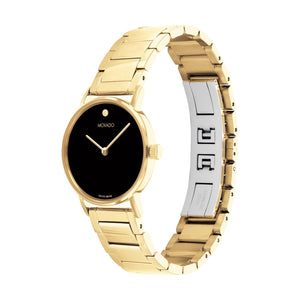 Movado signature womens watch. Stainless steel gold PVD finished case with a black dial. Sainless steel gold PVD finished link bracelet. Sapphire crystal. Case size 28mm. Quartz movement. Water resistance upto 30 meters. Deployment clasp with push button release.
