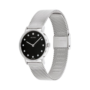 Womens movado signature, 28mm stainless steel case and mesh bracelet, black dial with diamond markers, swiss quartz movement. Water resistance up to 30 meters. Sapphire crystal. Sliding clasp.
