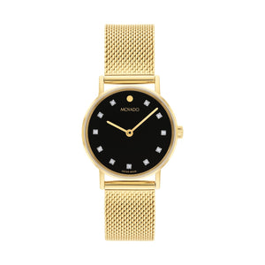 Womens movado signature, 28mm Yellow PVD case and mesh bracelet, black dial with diamond markers, swiss quartz movement. Case size 28 mm. Water resistance up to 30 meters. Sapphire crystal. Sliding clasp.