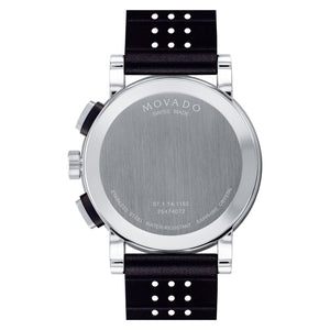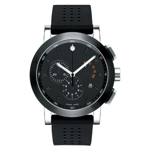 Mens movado signature Sport watch, 44mm stainless steel case, black PVD bezel, black dial featuring stainless steel polished hands with lumi, perforated black rubber strap, sapphire crystal, swiss quartz movement. Water resistance up to 30 meters. Buckle clasp.