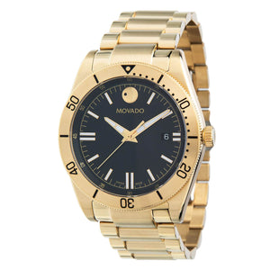 Yellow gold PVD stainless steel case and bracelet. Fixed yellow gold PVD bezel. Black dial with luminous yellow gold-tone hands and index hour markers. Minute markers around the outer rim. Movado dot appears at the 12 o'clock position. Dial Type: Analog. Luminescent hands and markers. Date display at the 3 o'clock position. Quartz movement. Scratch resistant sapphire crystal. Pull / push crown. Solid case back. Round case shape. Case size: 41 mm. Case thickness: 10 mm. Band width: 22 mm. Butterfly clasp. Water resistant at 30 meters / 100 feet. Functions: date, hour, minute, second. Sport Series. Casual watch style. Watch label: Swiss Made. Movado Sport Quartz Black Dial Men's Watch 0607436.