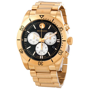Gold tone stainless steel case and bracelet. Uni directional rotating gold tone bezel. Black dial with luminous gold tone hands and index hour markers. Minute markers. Arabic numeral minute markers at 5 minute intervals around the outer rim. Dial type analog. Luminescent hands and markers. Date display at the 4 o'clock position. chronograph three silver sub dials displaying 60 second, 30 minute and 1/10th of a second. Quartz movement. Scratch resistant sapphire crystal. Pull / push crown. Solid case back. Round case shape. Case size 41 mm. Case thickness 10 mm. Band width: 20 mm. Fold over clasp with a push button release. Water resistant at 30 meters / 100 feet. Functions date, hour, minute, second. Sport series. Sport watch style. Watch label swiss made. Movado sport chronograph quartz black dial mens watch 0607440.