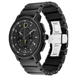 Movado Strato Chronograph, 44mm black and dark gunmetal PVD-finished stainless steel case and bracelet with a matte black chronograph dial and black tinted transparent date ring inlay. Features dot, hands and markers with white Swiss Super-LumiNova. Special seconds sweep and subeye hands with accented yellow Swiss Super-LumiNova tips. Water resistane upto 30 meters.