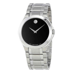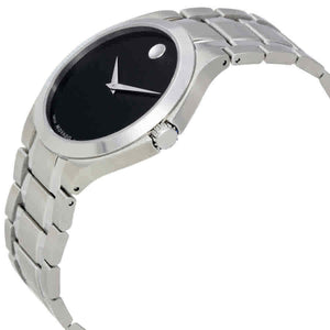 Sainless steel case with a stainless steel bracelet. Fixed stainless steel bezel. Black dial with silver tone dauphine style shape hands. No markers. The Movado dot appears at the 12 o'clock position. Dial type analog. Quartz movement. Scratch resistant K1 mineral crystal. Pull / push crown. Solid case back. Round case shape. Case size 40 mm. Case thickness: 7 mm. Band width: 22 mm. Deployment clasp with a push button release. Water resistant at 30 meters 100 feet. Functions: hour, minute. Swiss Collection Series. Dress watch style. Watch label: Swiss Made. Movado Collection Black Dial Stainless Steel Men's Watch 0606781.