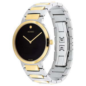 Mens movado temo watch, 38mm stainless steel and yellow pvd case and bracelet with deployment buckle, black Museum dial, sapphire crystal, swiss quartz movement. Water resistance up to 30 meters.