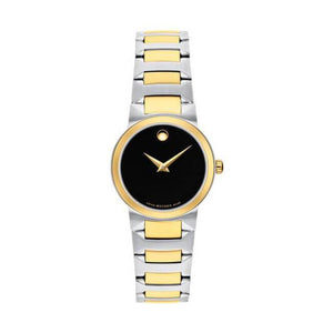 Women's Temo watch, 26mm stainless steel and yellow PVD case and link bracelet with deployment clasp, black Museum dial with concave dot, sapphire crystal, Swiss quartz movement. Water resistance upto 30 meters.