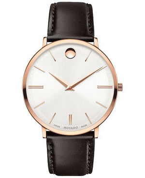 Movado Men's Ultra Slim watch, 40 mm rose gold PVD-finished stainless steel case, 6.3 mm thin; rose gold-toned signature dot and thin applied stick markers; chocolate brown calfskin strap with matching top-stitching and rose gold PVD-finished stainless steel watch.