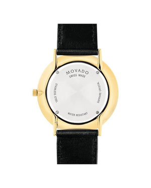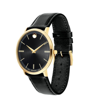 Yellow gold PVD stainless steel case with a Black (calfskin) leather strap. Fixed yellow gold PVD bezel. Black sunray dial with yellow gold-tone dauphine-style shape hands and index hour markers. The Movado dot appears at the 12 o'clock position. Dial Type: Analog. Quartz movement. Scratch resistant sapphire crystal. Pull / push crown. Solid case back. Round case shape. Case size: 40 mm. Case thickness: 6.3 mm. Band width: 20 mm. Tang clasp. Water resistant at 30 meters / 100 feet. Functions: hour, minute. Dress watch style. Watch label: Swiss Made. Movado Ultra Slim Black Sunray Dial Men's Watch 0607087.