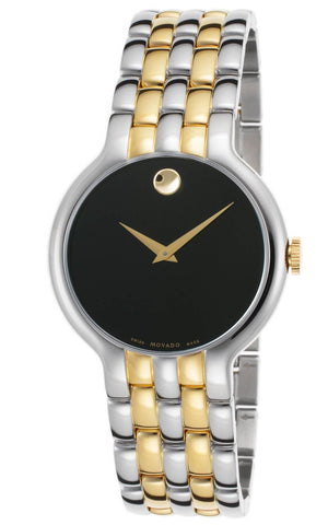 Stainless steel case with a two-tone (silver-tone and yellow gold PVD ) stainless steel bracelet. Fixed stainless steel bezel. Black dial with yellow gold-tone dauphine-style hands. No markers. The Movado dot marks the 12 o'clock position. Dial Type: Analog. Quartz movement. Scratch resistant sapphire crystal. Pull / push crown. Solid case back. Round case shape. Case size: 38 mm. Case thickness: 7 mm. Band width: 20 mm. Band length: 8 inches. Jewelry clasp. Water resistant at 30 meters / 100 feet. Functions: hour, minute. Casual watch style. Watch label: Swiss Made. Movado Veturi Black Dial Two-tone Men's Watch 0606932.