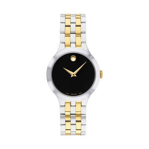 Movado Veturi, women's 28mm stainless steel and yellow PVD case and link bracelet with deployment clasp, black Museum dial with concave dot, sapphire crystal, Swiss quartz movement. Case size 28 mm. Water resistance upto 30 meters.