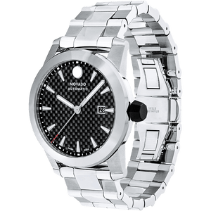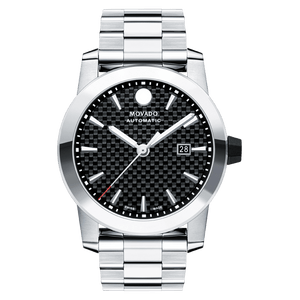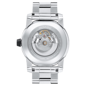 Movado Vizio Automatic, 44 mm stainless steel case with 904L steel bezel and black carbon fiber dial. Features a screw down crown, Swiss Super-LumiNova accents, and stainless steel bracelet. Caseback features an exposed automatic movement. Water resistance upto 50 meters.