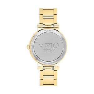 Striking modern design with a strong, sophisticated aesthetic. This timepiece is crafted from durable stainless steel with a gleaming yellow gold PVD finish. A bezel of Dura904, an innovative steel prized for its nearly indestructible nature, comfort on the skin, and ability to hold a beautiful polish, frames its 32mm case which houses a textured white dial finished with a date window and swiss super luminova hands, hour markers, and indices. The signature Vizio bullet lug bracelet completes the design. Light yellow gold PVD finished stainless steel case and bracelet with white dial. Quartz movement. Water resistance up to 50 meters. Sapphire crystal. Deployment clasp with push button.