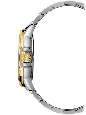 The tango Classic men's two-tone gold quartz steel bracelet watch features a stainless steel 41mm diameter round case, gold PVD plated materials, a sophisticated white dial punctuated by gold-plated Roman numeral markers, and a date window at 3 o'clock. The tango Classic men's gold steel bracelet watch is equipped with a quartz movement, water resistance up to 300 m, with a scratch-resistant surface, and offers durability in a bracelet-style watch perfect for the active man. With its date window located at 3 o'clock, check both the date and the time in one simple glance at the wrist.