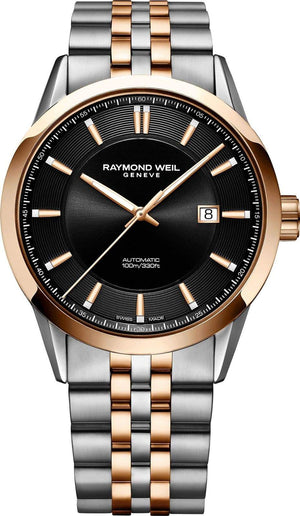 Raymond Weil Freelancer Equipped with a mechanical automatic winding movement housed in a 42mm-diameter case, this two-tone rose gold timepiece features a captivating and elegant black dial punctuated by a date function at 3 o'clock. Freelancer Classic Men's Rose Gold Automatic Watch, two-tone rose gold watch, black dial with indexes.