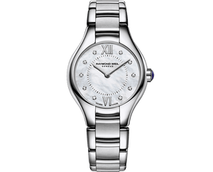 This exquisite timepiece from the highly coveted noemia collection features a 24mm stainless steel case, delicate mother of pearl dial set with 10 sparkling diamonds to mark the hours and 2 silver Roman numerals standing at 12 and 6 o’clock. The crown boasts a veil of midnight lacquer which affirms the dual identity of this watch – both sweet and desirable.Named after the granddaughter of Mr. Raymond Weil, the noemia collection captures an elegance and timeless style with a touch of contemporary. This feminine timepiece fitted with a quartz movement, is available in 24, 32 or 36mm case to accommodate all wrist sizes. The gracefully formed horns of the bezel merge with the sleek stainless steel bracelet which includes polished and satin-finish links and display curved and rounded contours. This watch is great for everyday wear or special occasions and will impress a woman who appreciates beauty. water resistance upto 50 meters.