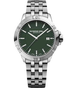 The tango Classic men’s watch features a stainless steel 41mm diameter round case, a sophisticated green dial punctuated by indexes enhanced with Super-LumiNova® and a date window at 3 o’clock. This timepiece is equipped with a quartz movement, water-resistance up to 1000 feet with a scratch-resistant surface, and offers durability in a bracelet-style watch perfect for the active man. With its date window located at 3 o’clock, check both the date and the time in one simple glance at the wrist. The tango collection embodies the passion that RAYMOND WEIL, the Swiss watchmaker, puts into achieving timepieces of both aesthetic sensuality of design and rhythmic perfection. With its refined and modern design, this contemporary collection appeals to both men and women. Featuring a quartz movement, the gents’ timepieces boast a sober and refined style while the ladies’ models are graced with frosted dial and diamonds. Distinctive style with a balance of proportions, the tango watch has a distinguishing signature bezel featuring six decorative screws. Functionality marries with sensual design, making this a watch worn to suit any occasion.
