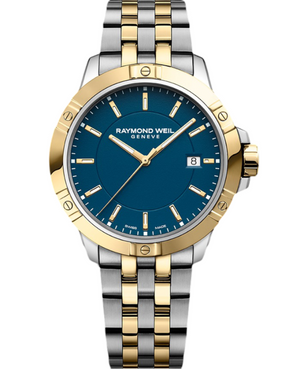 The tango Classic men’s two-tone gold quartz steel bracelet watch features a stainless steel 41mm diameter round case, gold PVD plated materials, a sophisticated blue dial punctuated by indexes enhanced with Super-LumiNova®, and a date window at 3 o’clock. The tango Classic men’s gold steel bracelet watch is equipped with a quartz movement, water-resistance up to 1000 feet with a scratch-resistant surface, and offers durability in a bracelet-style watch perfect for the active man. With its date window located at 3 o’clock, check both the date and the time in one simple glance at the wrist. The tango collection embodies the passion that RAYMOND WEIL, the Swiss watchmaker, puts into achieving timepieces of both aesthetic sensuality of design and rhythmic perfection. With its refined and modern design, this contemporary collection appeals to both men and women. Featuring a quartz movement, the gents’ timepieces boast a sober and refined style while the ladies’ models are graced with frosted dial and diamonds. Distinctive style with a balance of proportions, the tango watch has a distinguishing signature bezel featuring six decorative screws. Functionality marries with sensual design, making this a watch worn to suit any occasion.