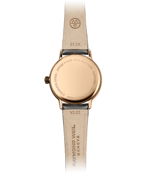 Equipped with a quartz movement, this toccata ladies’ watch features a 29 mm stainless steel case with rose gold PVD plating decorated with 76 diamonds. The rosé colour lacquered and sunray satin-finished dial is set with applied Roman numeral indexes and has a railway-track chapter ring that aids readability. To complement this modern classic, a grey satin strap has been added.Refined design and timeless materials: the toccata collection celebrates the artistic and musical spirit behind the Brand’s DNA. Following in the footsteps of the great composers, timepieces promote the Swiss horology of RAYMOND WEIL while respecting the tradition and heritage handed down from generation to generation within the family company.