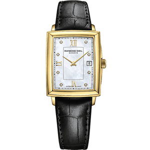 A popular style in the art deco era of the 1920s and 1930s, square-faced watches are making a chic new revival. RAYMOND WEIL introduces this design in the form of our ever-classic and popular ladies’ toccata collection.This new quartz model adopts a sophisticated art deco appeal with an elongated rectangular face and slim 6.25 mm case. This is our shallowest case design to date which gives a very sleek profile to this watch.This timepiece of choice is available in several variations. The face comes in combinations of black roman numerals on a crisp white dial or alternating gold & diamond indexes on a mother-of-pearl face.The sapphire crystal window is framed by a beveled rectangular case. The tiered design gives this watch an illusion of depth without the thickness. The watch is completed with RW monogram signature upon the crown.Unlike the classic round ladies’ toccata, this watch manages to nail a refined, retro aesthetic all the while remaining true to the Swiss craftsmanship and inspiration behind the collection. Water resistant up to 50 meters