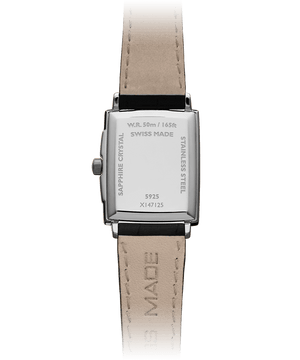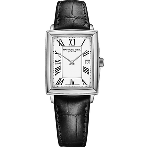 A popular style in the art deco era of the 1920s and 1930s, square-faced watches are making a chic new revival. RAYMOND WEIL introduces this design in the form of our ever-classic and popular ladies’ toccata collection.This new quartz model adopts a sophisticated art deco appeal with an elongated rectangular face and slim 6.25 mm case. This is our shallowest case design to date which gives a very sleek profile to this watch.This timepiece of choice is available in several variations. The face comes in combinations of black roman numerals on a crisp white dial or alternating gold & diamond indexes on a mother-of-pearl face.The sapphire crystal window is framed by a beveled rectangular case. The tiered design gives this watch an illusion of depth without the thickness. The watch is completed with RW logo signature upon the crown.Unlike the classic round ladies’ toccata, this watch manages to nail a refined, retro aesthetic all the while remaining true to the Swiss craftsmanship and inspiration behind the collection. Water resistant up to 50 meters